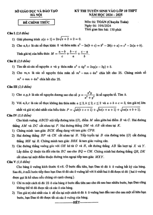 Đề tuyển sinh lớp 10 môn Toán (chuyên) năm 2024 – 2025 sở GD&ĐT Hà Nội