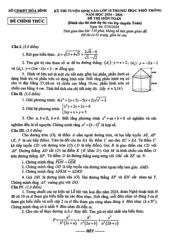 Đề tuyển sinh lớp 10 môn Toán (chuyên) năm 2024 – 2025 sở GD&ĐT Hòa Bình