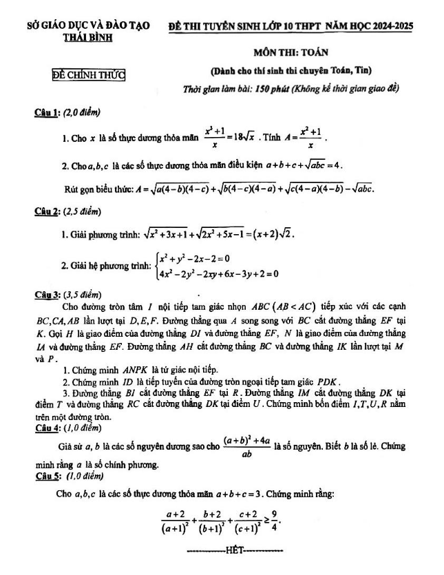 Đề tuyển sinh lớp 10 môn Toán (chuyên) năm 2024 – 2025 sở GD&ĐT Thái Bình