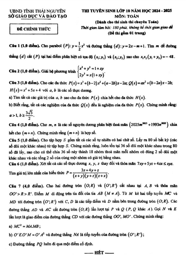 Đề tuyển sinh lớp 10 môn Toán (chuyên) năm 2024 – 2025 sở GD&ĐT Thái Nguyên