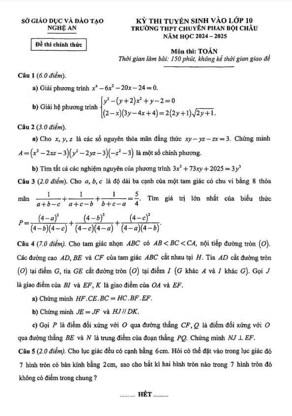Đề tuyển sinh lớp 10 môn Toán năm 2024 – 2025 trường chuyên Phan Bội Châu – Nghệ An