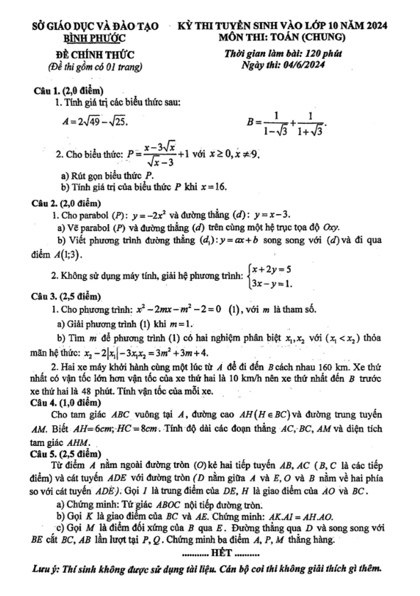 Đề tuyển sinh lớp 10 năm 2024 môn Toán (chung) sở GD&ĐT Bình Phước