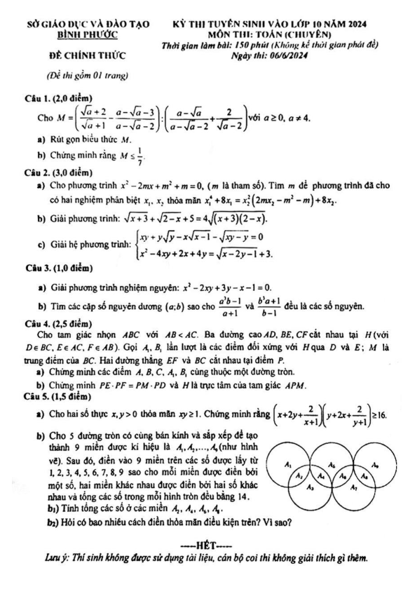 Đề tuyển sinh lớp 10 năm 2024 môn Toán (chuyên) sở GD&ĐT Bình Phước