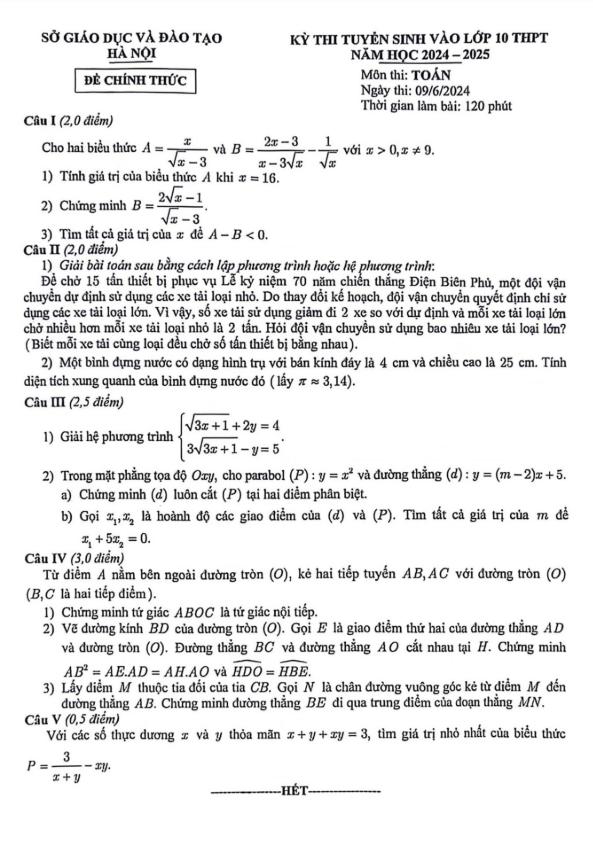 Đề tuyển sinh lớp 10 THPT môn Toán năm 2024 – 2025 sở GD&ĐT Hà Nội