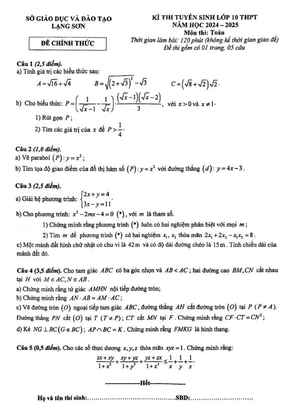 Đề tuyển sinh lớp 10 THPT môn Toán năm 2024 – 2025 sở GD&ĐT Lạng Sơn