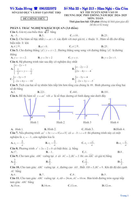Đề tuyển sinh lớp 10 THPT môn Toán năm 2024 – 2025 sở GD&ĐT Phú Thọ