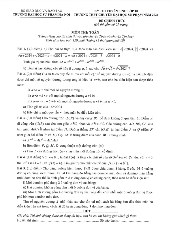 Đề tuyển sinh lớp 10 môn Toán (chuyên) năm 2024 trường THPT chuyên ĐHSP Hà Nội