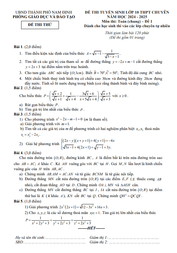 Đề Thi Tuyển Sinh Lớp 10 Môn Toán Đề thi thử Toán (chung) vào 10 chuyên năm 2024 – 2025 phòng GD&ĐT TP Nam Định 12/05/2024