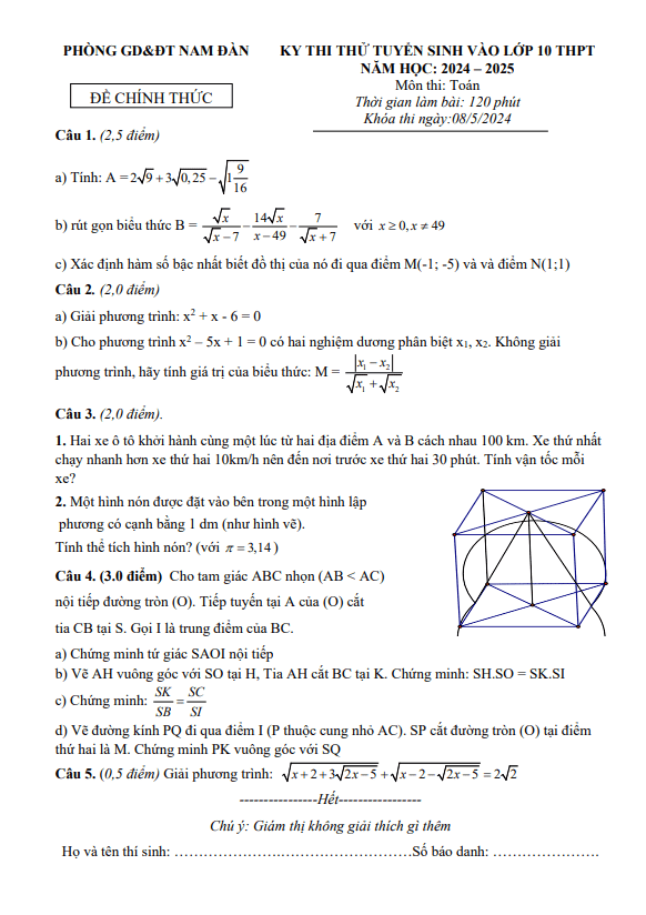 Đề Thi Tuyển Sinh Lớp 10 Môn Toán Đề thi thử Toán tuyển sinh lớp 10 năm 2024 – 2025 phòng GD&ĐT Nam Đàn – Nghệ An 11/05/2024