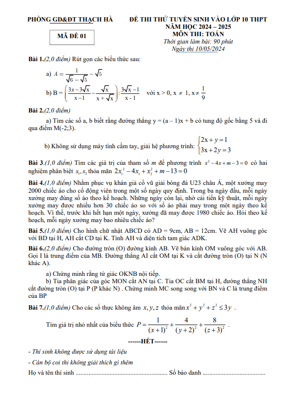 Đề Thi Tuyển Sinh Lớp 10 Môn Toán Đề thi thử Toán tuyển sinh lớp 10 năm 2024 – 2025 phòng GD&ĐT Thạch Hà – Hà Tĩnh 11/05/2024