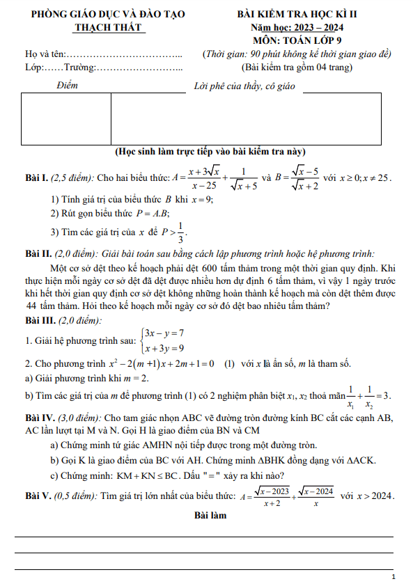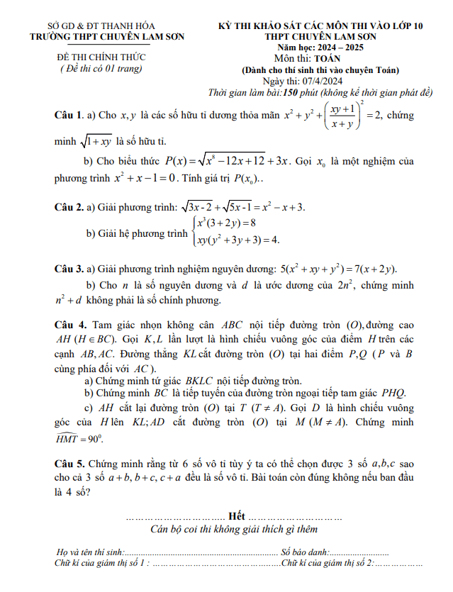 Đề Thi Tuyển Sinh Lớp 10 Môn Toán Đề khảo sát Toán (chuyên) vào 10 năm 2024 – 2025 trường chuyên Lam Sơn – Thanh Hóa 18/04/2024