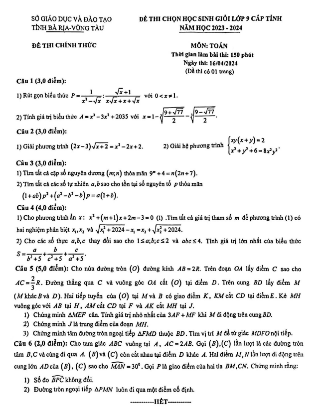 Đề Thi HSG Toán 9 Đề học sinh giỏi Toán 9 cấp tỉnh năm 2023 – 2024 sở GD&ĐT Bà Rịa – Vũng Tàu 18/04/2024