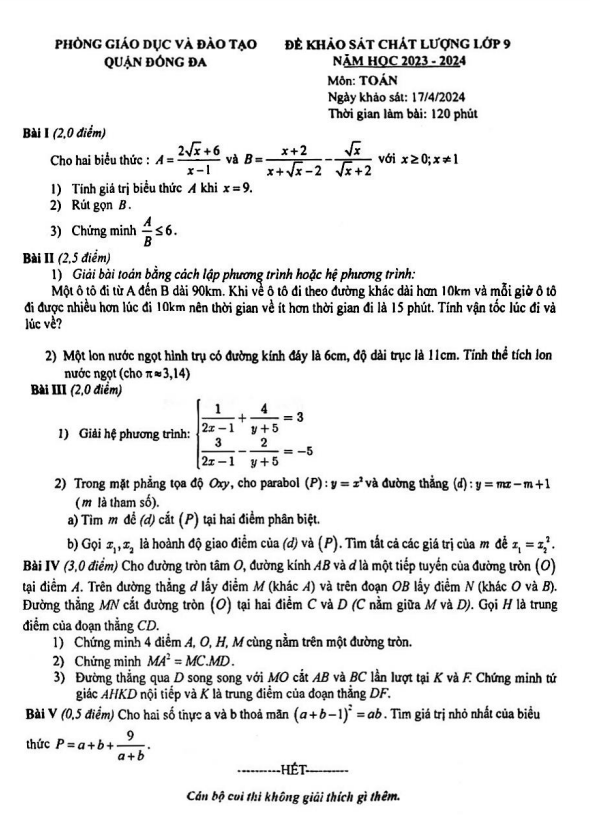 Khảo Sát Chất Lượng Toán 9 Đề khảo sát chất lượng Toán 9 năm 2023 – 2024 phòng GD&ĐT Đống Đa – Hà Nội 17/04/2024