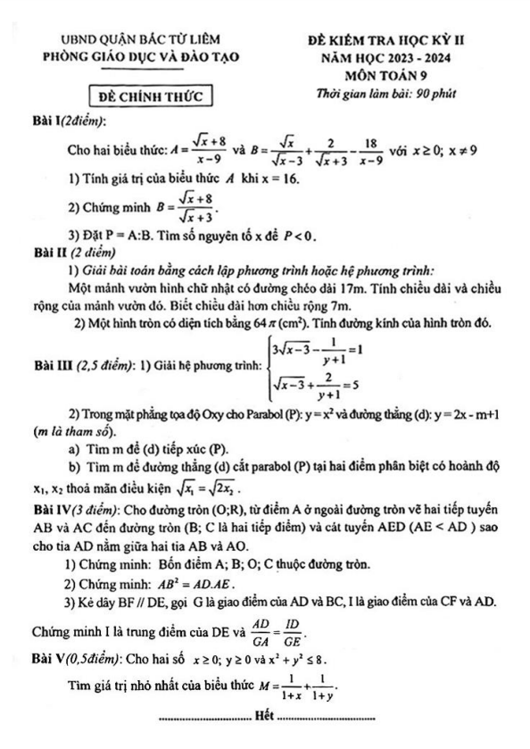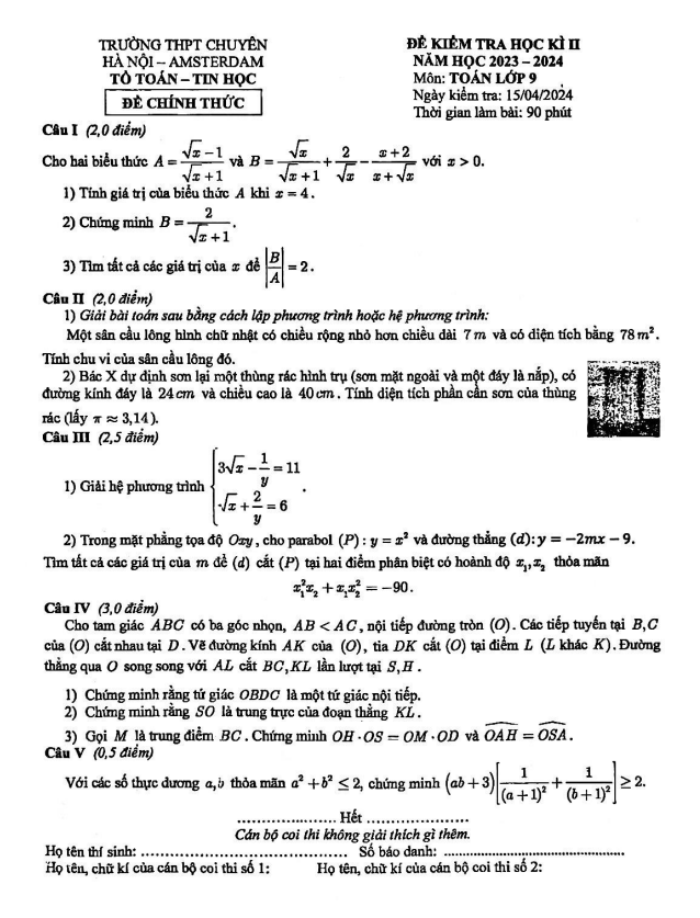 Đề Thi HK2 Toán 9 Đề học kì 2 Toán 9 năm 2023 – 2024 trường THPT chuyên Hà Nội – Amsterdam 15/04/2024