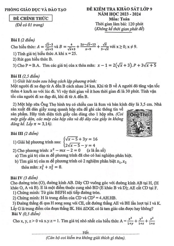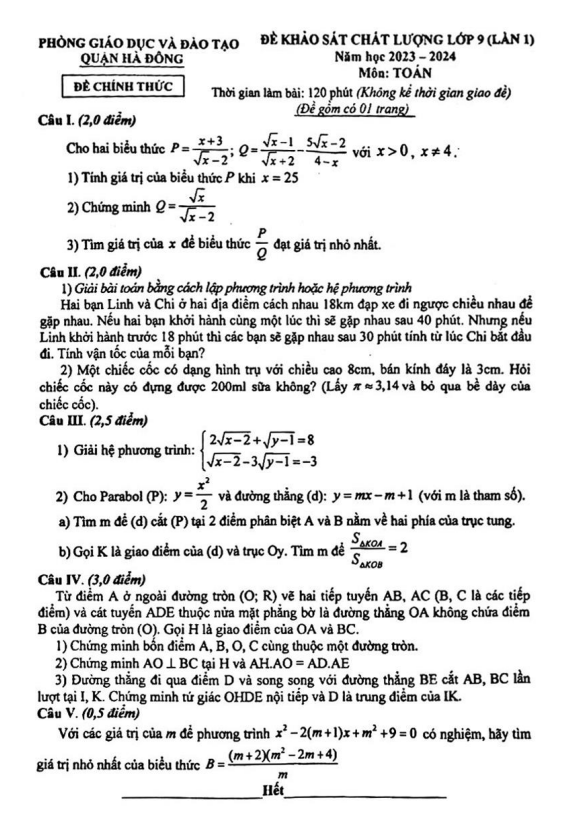 Khảo Sát Chất Lượng Toán 9 Đề khảo sát Toán 9 lần 1 năm 2023 – 2024 phòng GD&ĐT Hà Đông – Hà Nội 12/04/2024