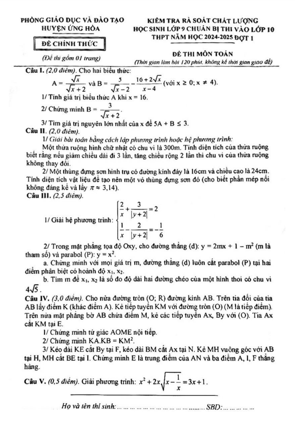 Đề Thi Tuyển Sinh Lớp 10 Môn Toán Đề kiểm tra Toán 9 thi vào 10 năm 2024 – 2025 đợt 1 phòng GD&ĐT Ứng Hòa – Hà Nội 15/04/2024