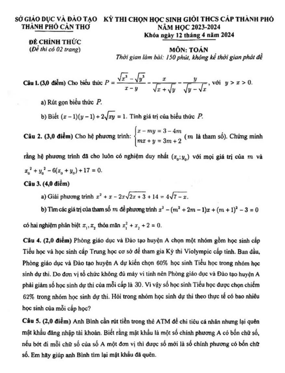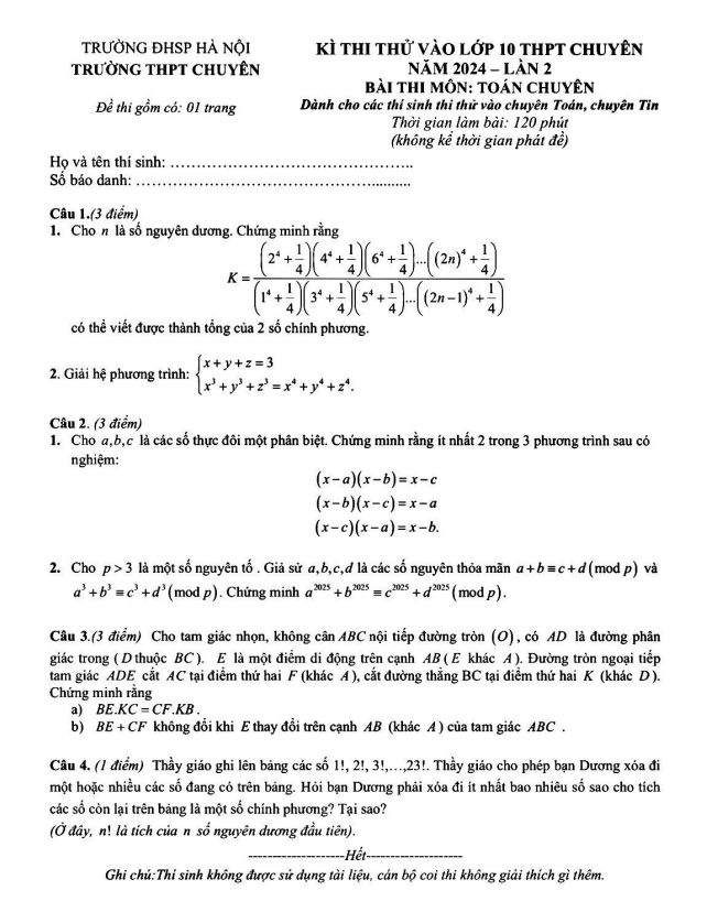Đề Thi Tuyển Sinh Lớp 10 Môn Toán Đề thi thử vào 10 chuyên môn Toán (chuyên) năm 2024 lần 2 trường chuyên ĐHSP Hà Nội 15/04/2024