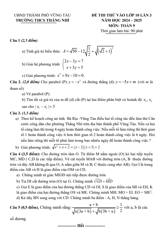 Đề Thi Tuyển Sinh Lớp 10 Môn Toán Đề thi thử Toán vào lớp 10 lần 3 năm 2024 – 2025 trường THCS Thắng Nhì – BR VT 15/04/2024