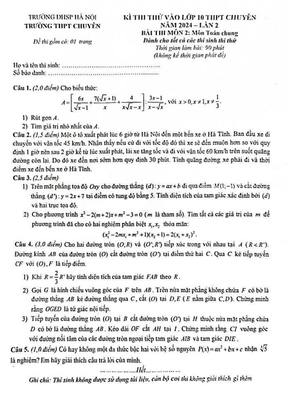 Đề Thi Tuyển Sinh Lớp 10 Môn Toán Đề thi thử vào 10 chuyên môn Toán (chung) năm 2024 lần 2 trường chuyên ĐHSP Hà Nội 15/04/2024