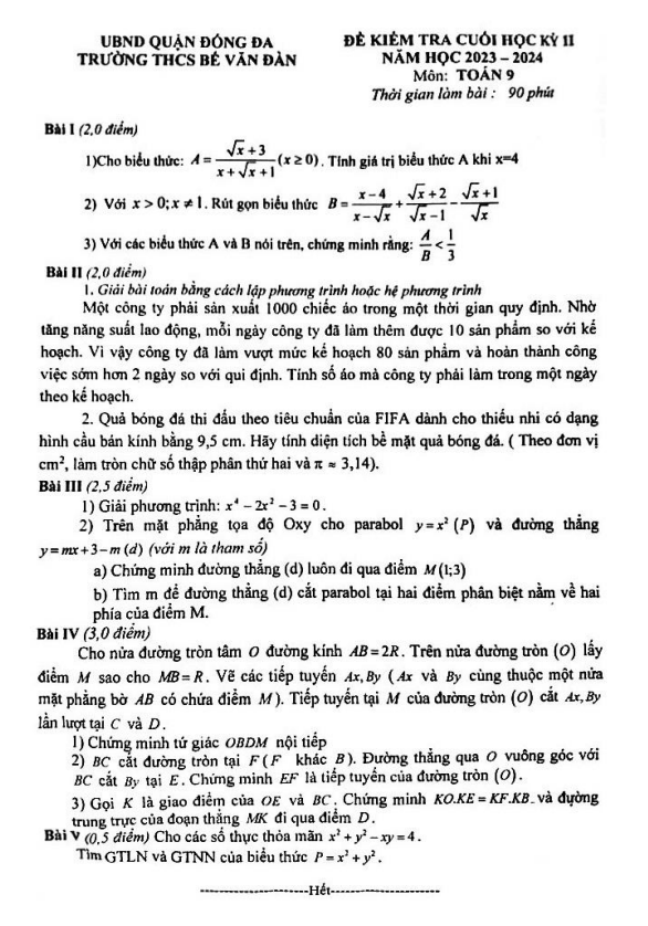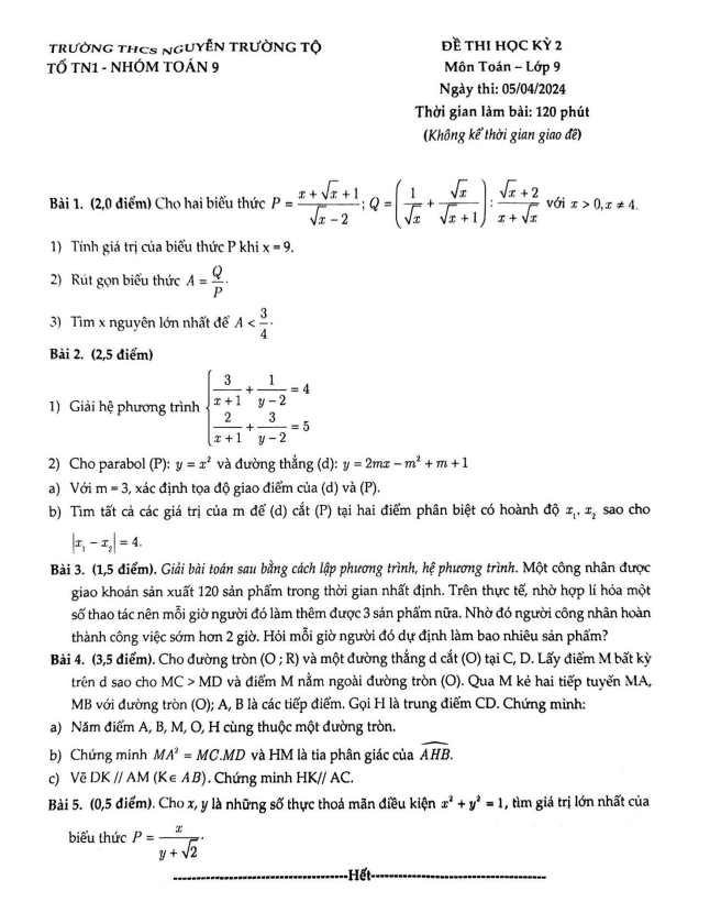 Đề Thi HK2 Toán 9 Đề thi học kỳ 2 Toán 9 năm 2023 – 2024 trường THCS Nguyễn Trường Tộ – Hà Nội 08/04/2024