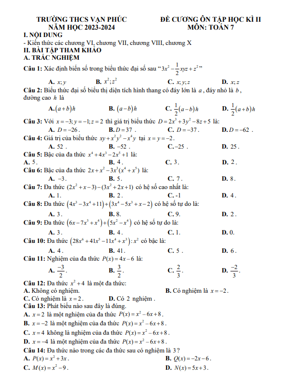 Đề Cương Ôn Tập Toán 7 Đề cương cuối học kì 2 Toán 7 năm 2023 – 2024 trường THCS Vạn Phúc – Hà Nội 08/04/2024