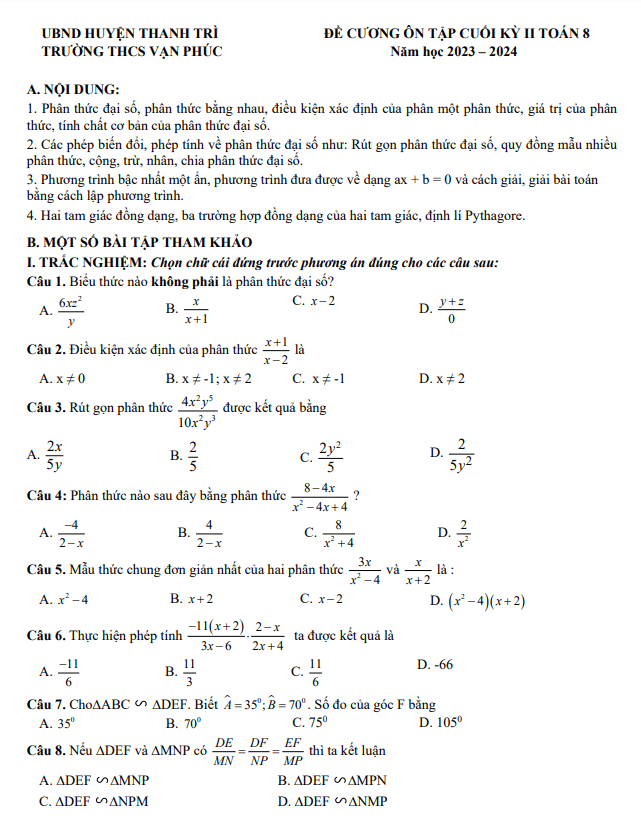 Đề Cương Ôn Tập Toán 8 Đề cương cuối học kì 2 Toán 8 năm 2023 – 2024 trường THCS Vạn Phúc – Hà Nội 08/04/2024