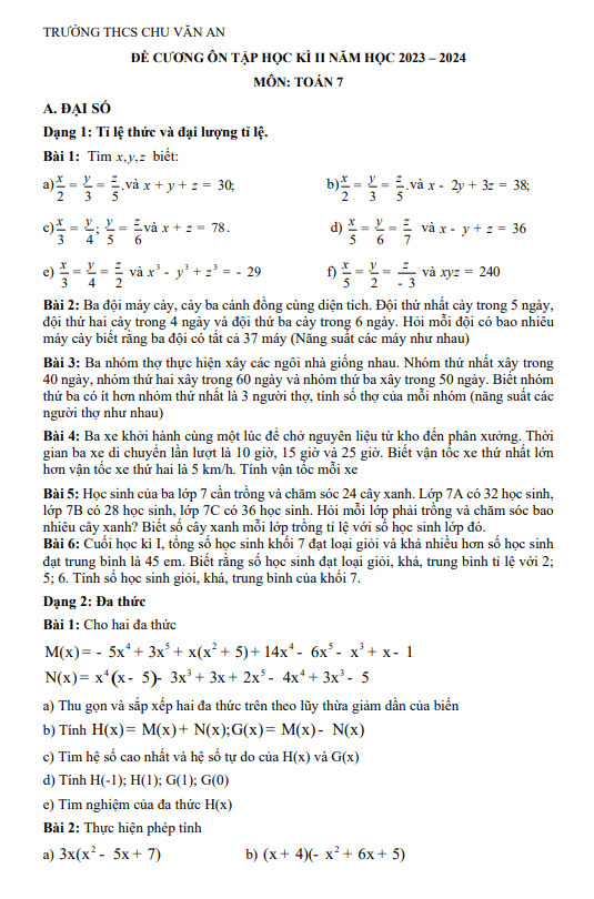 Đề Cương Ôn Tập Toán 7 Đề cương học kì 2 Toán 7 năm 2023 – 2024 trường THCS Chu Văn An – Hà Nội 08/04/2024