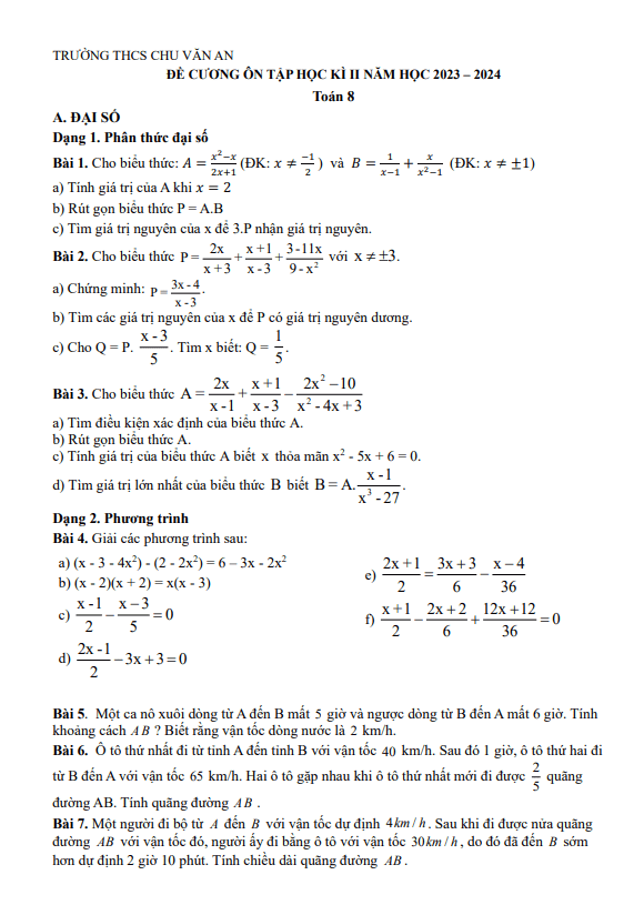 Đề Cương Ôn Tập Toán 8 Đề cương học kì 2 Toán 8 năm 2023 – 2024 trường THCS Chu Văn An – Hà Nội 08/04/2024