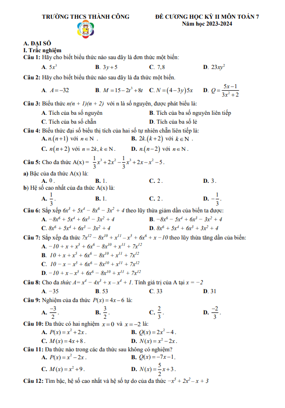 Đề Cương Ôn Tập Toán 7 Đề cương học kỳ 2 Toán 7 năm 2023 – 2024 trường THCS Thành Công – Hà Nội 08/04/2024