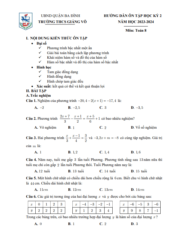 Đề Cương Ôn Tập Toán 8 Đề cương học kỳ 2 Toán 8 năm 2023 – 2024 trường THCS Giảng Võ – Hà Nội 08/04/2024