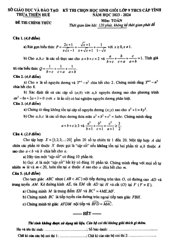 Đề Thi HSG Toán 9 Đề học sinh giỏi Toán 9 cấp tỉnh năm 2023 – 2024 sở GD&ĐT Thừa Thiên Huế 08/04/2024