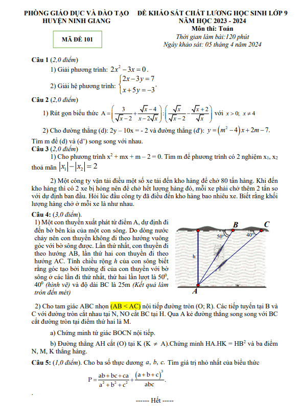 Khảo Sát Chất Lượng Toán 9 Đề khảo sát Toán 9 năm 2023 – 2024 phòng GD&ĐT Ninh Giang – Hải Dương 08/04/2024