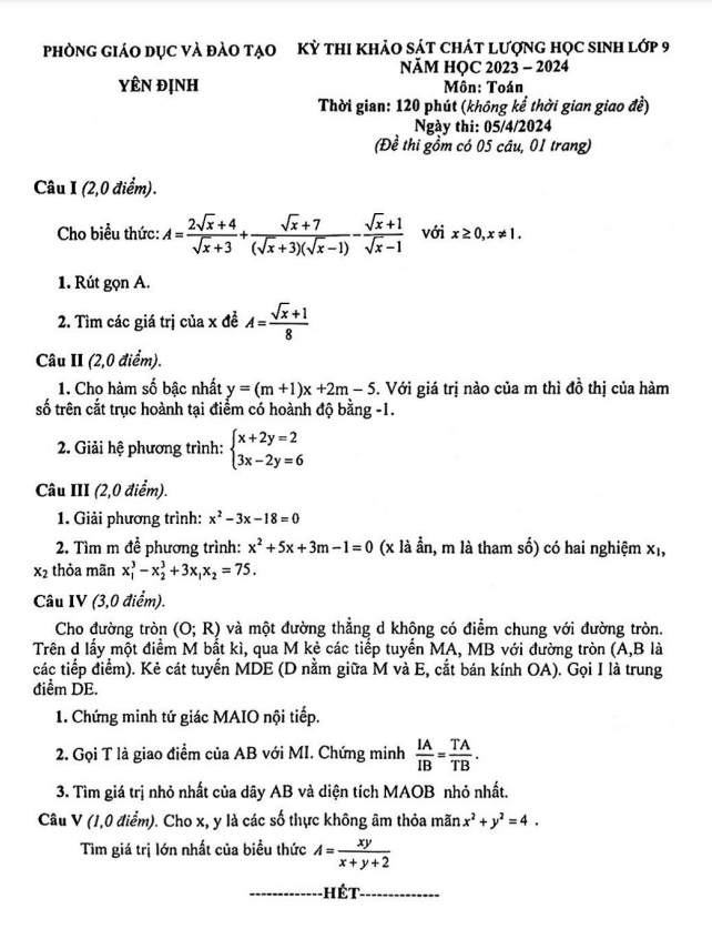 Khảo Sát Chất Lượng Toán 9 Đề khảo sát Toán 9 năm 2023 – 2024 phòng GD&ĐT Yên Định – Thanh Hóa 08/04/2024