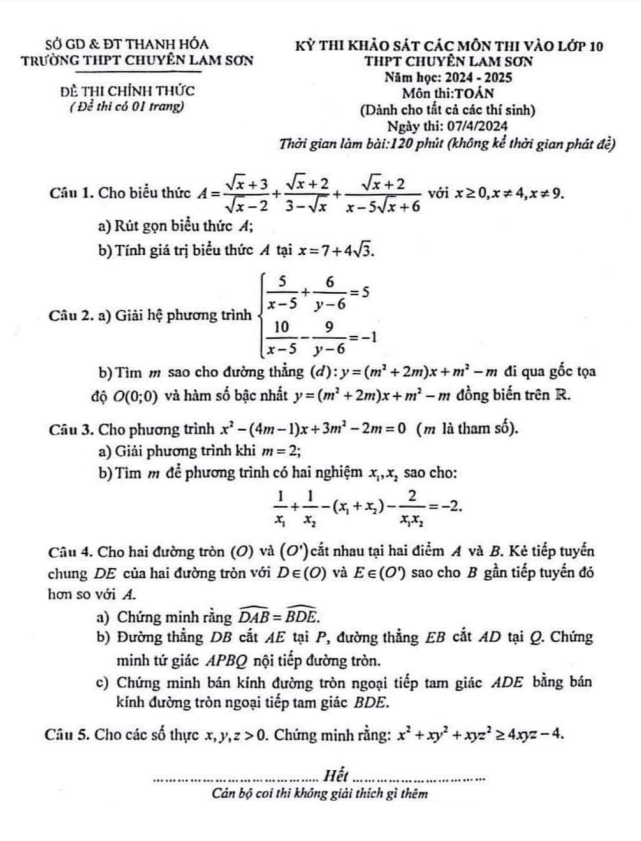 Đề Thi Tuyển Sinh Lớp 10 Môn Toán Đề khảo sát Toán vào 10 năm 2024 – 2025 trường chuyên Lam Sơn – Thanh Hóa 08/04/2024