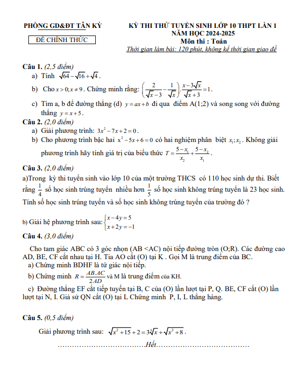 Đề Thi Tuyển Sinh Lớp 10 Môn Toán Đề thi thử Toán vào lớp 10 lần 1 năm 2024 – 2025 phòng GD&ĐT Tân Kỳ – Nghệ An 08/04/2024