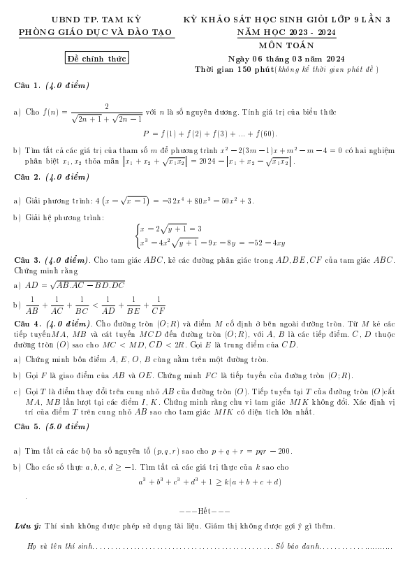 Đề Thi HSG Toán 9 Đề khảo sát HSG Toán 9 lần 3 năm 2023 – 2024 phòng GD&ĐT Tam Kỳ – Quảng Nam 03/04/2024
