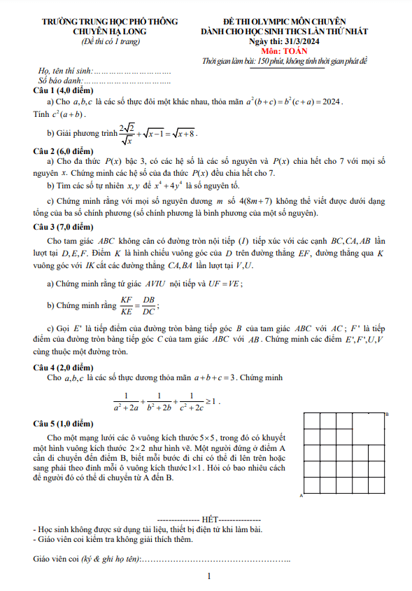 Đề Thi HSG Toán 9 Đề Olympic chuyên Toán THCS lần 1 năm 2023 – 2024 trường chuyên Hạ Long – Quảng Ninh 03/04/2024