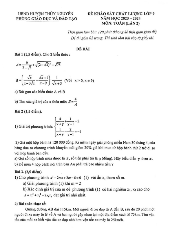 Khảo Sát Chất Lượng Toán 9 Đề khảo sát Toán 9 lần 2 năm 2023 – 2024 phòng GD&ĐT Thủy Nguyên – Hải Phòng 01/04/2024