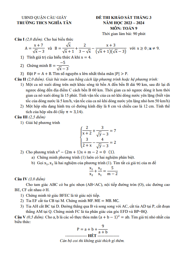 Khảo Sát Chất Lượng Toán 9 Đề khảo sát Toán 9 tháng 3 năm 2024 trường THCS Nghĩa Tân – Hà Nội 01/04/2024