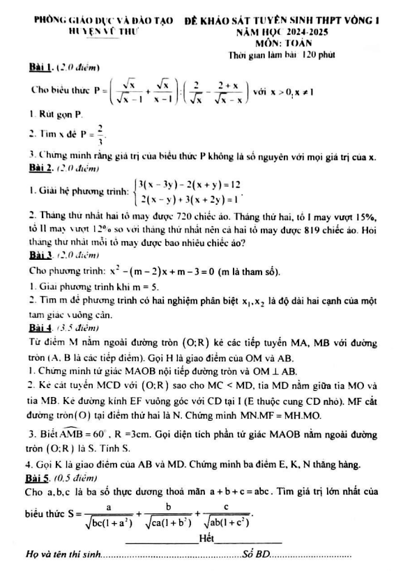 Đề Thi Tuyển Sinh Lớp 10 Môn Toán Đề khảo sát Toán vào 10 vòng 1 năm 2024 – 2025 phòng GD&ĐT Vũ Thư – Thái Bình 01/04/2024