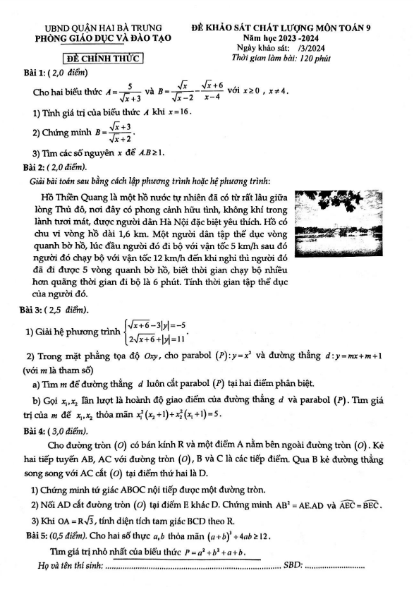 Khảo Sát Chất Lượng Toán 9 Đề khảo sát Toán 9 năm 2023 – 2024 phòng GD&ĐT Hai Bà Trưng – Hà Nội 29/03/2024