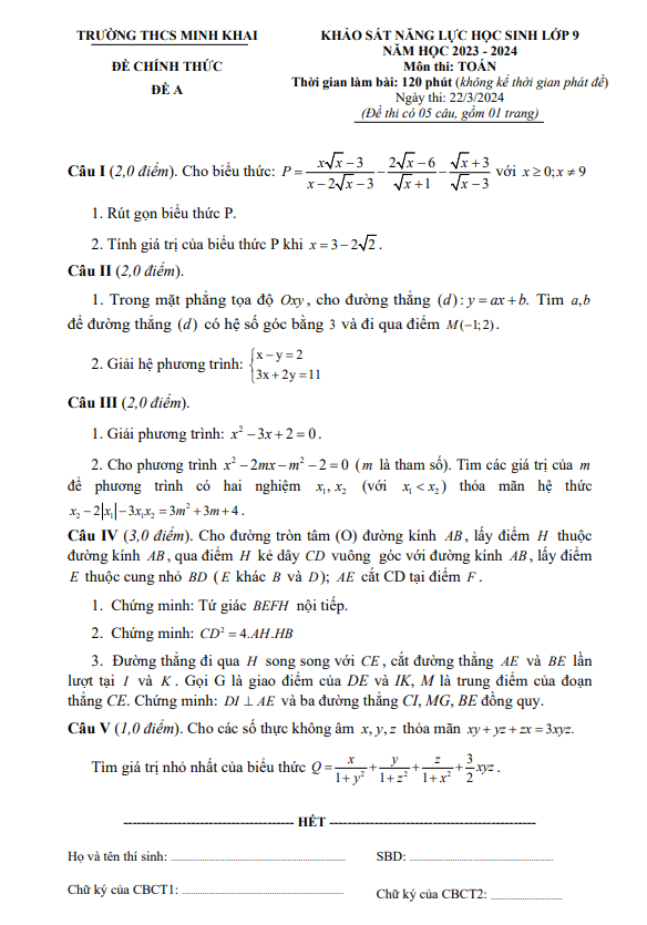 Khảo Sát Chất Lượng Toán 9 Đề khảo sát Toán 9 năm 2023 – 2024 trường THCS Minh Khai – Hà Nội 29/03/2024