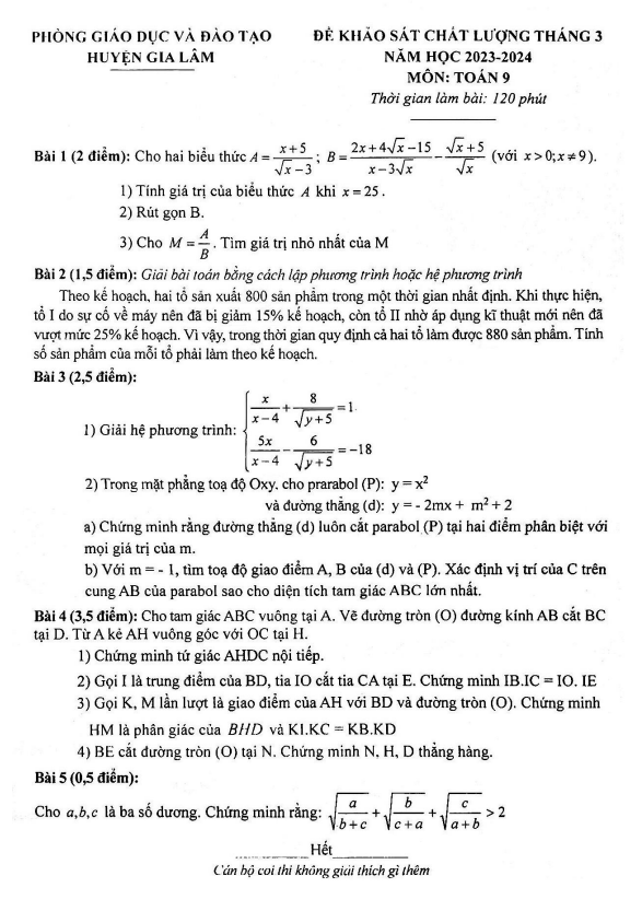 Khảo Sát Chất Lượng Toán 9 Đề khảo sát Toán 9 tháng 3 năm 2024 phòng GD&ĐT Gia Lâm – Hà Nội 29/03/2024