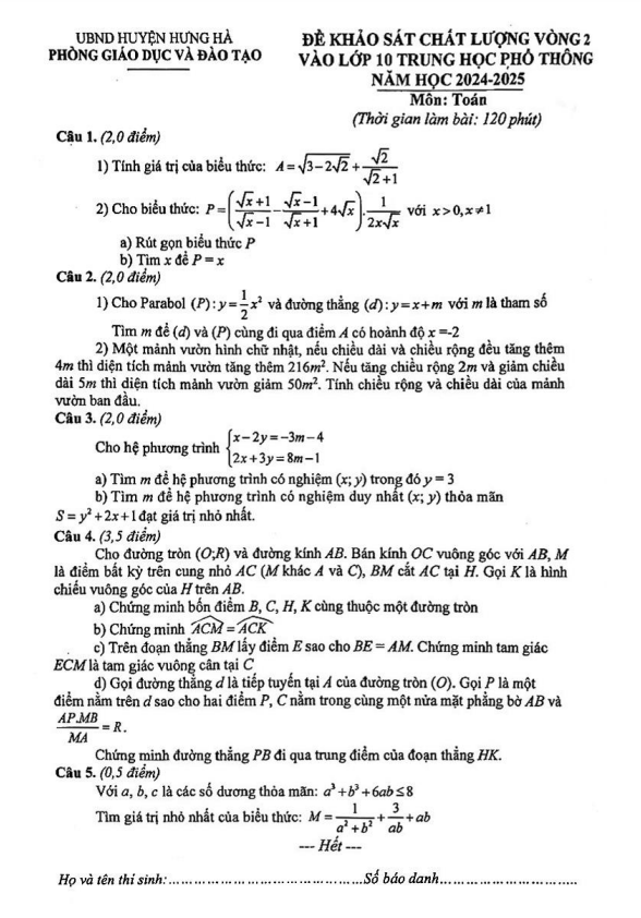 Đề Thi Tuyển Sinh Lớp 10 Môn Toán Đề KSCL Toán vào lớp 10 vòng 2 năm 2024 – 2025 phòng GD&ĐT Hưng Hà – Thái Bình 27/03/2024