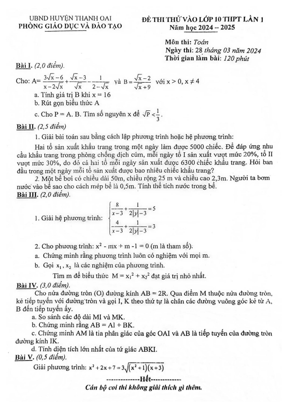 Đề Thi Tuyển Sinh Lớp 10 Môn Toán Đề thi thử Toán vào lớp 10 lần 1 năm 2024 – 2025 phòng GD&ĐT Thanh Oai – Hà Nội 28/03/2024