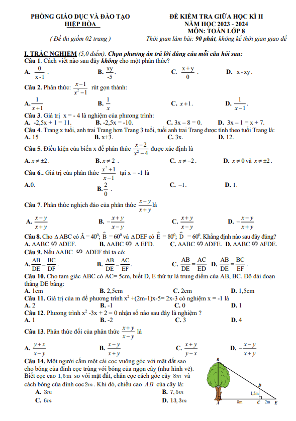 Đề Thi Giữa HK2 Toán 8 Đề giữa học kì 2 Toán 8 năm 2023 – 2024 phòng GD&ĐT Hiệp Hòa – Bắc Giang 24/03/2024