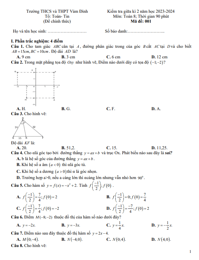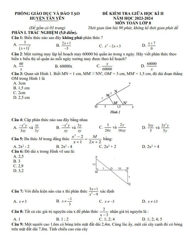 Đề Thi Giữa HK2 Toán 8 Đề giữa học kì 2 Toán 8 năm 2023 – 2024 phòng GD&ĐT Tân Yên – Bắc Giang 22/03/2024