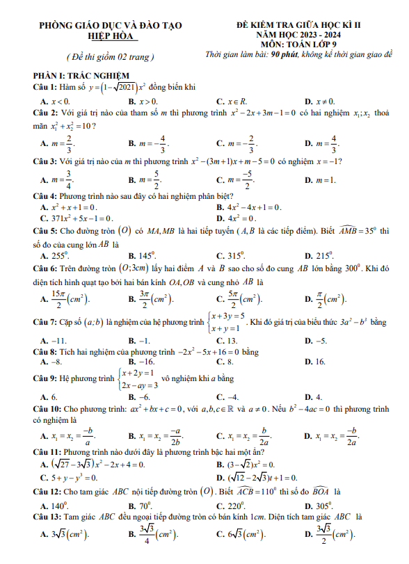Đề Thi Giữa HK2 Toán 9 Đề giữa học kì 2 Toán 9 năm 2023 – 2024 phòng GD&ĐT Hiệp Hòa – Bắc Giang 24/03/2024