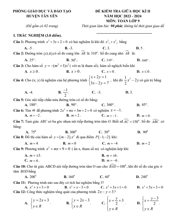 Đề Thi Giữa HK2 Toán 9 Đề giữa học kì 2 Toán 9 năm 2023 – 2024 phòng GD&ĐT Tân Yên – Bắc Giang 22/03/2024