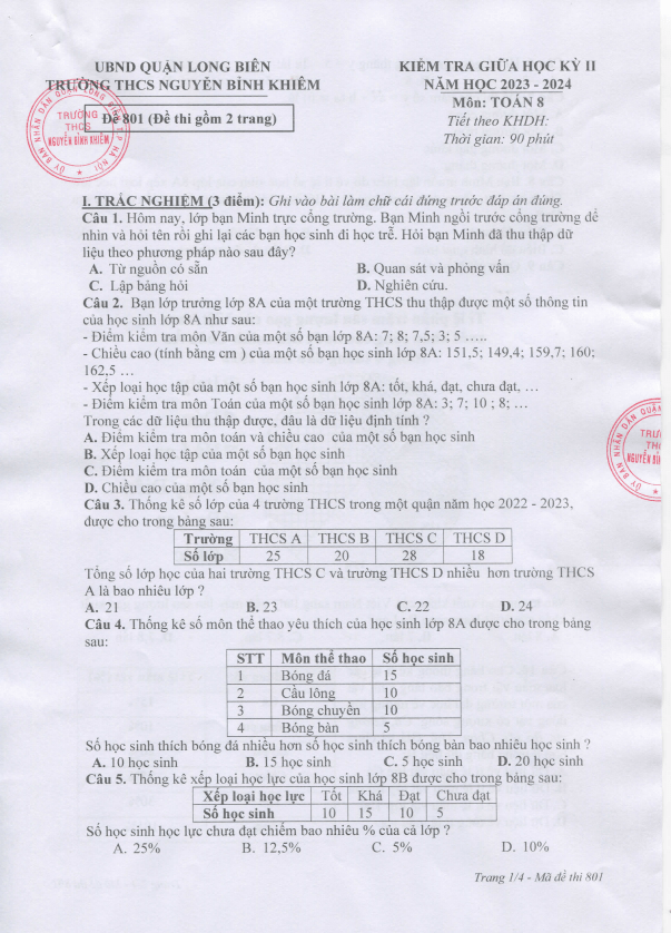 Đề Thi Giữa HK2 Toán 8 Đề giữa học kỳ 2 Toán 8 năm 2023 – 2024 trường THCS Nguyễn Bỉnh Khiêm – Hà Nội 22/03/2024